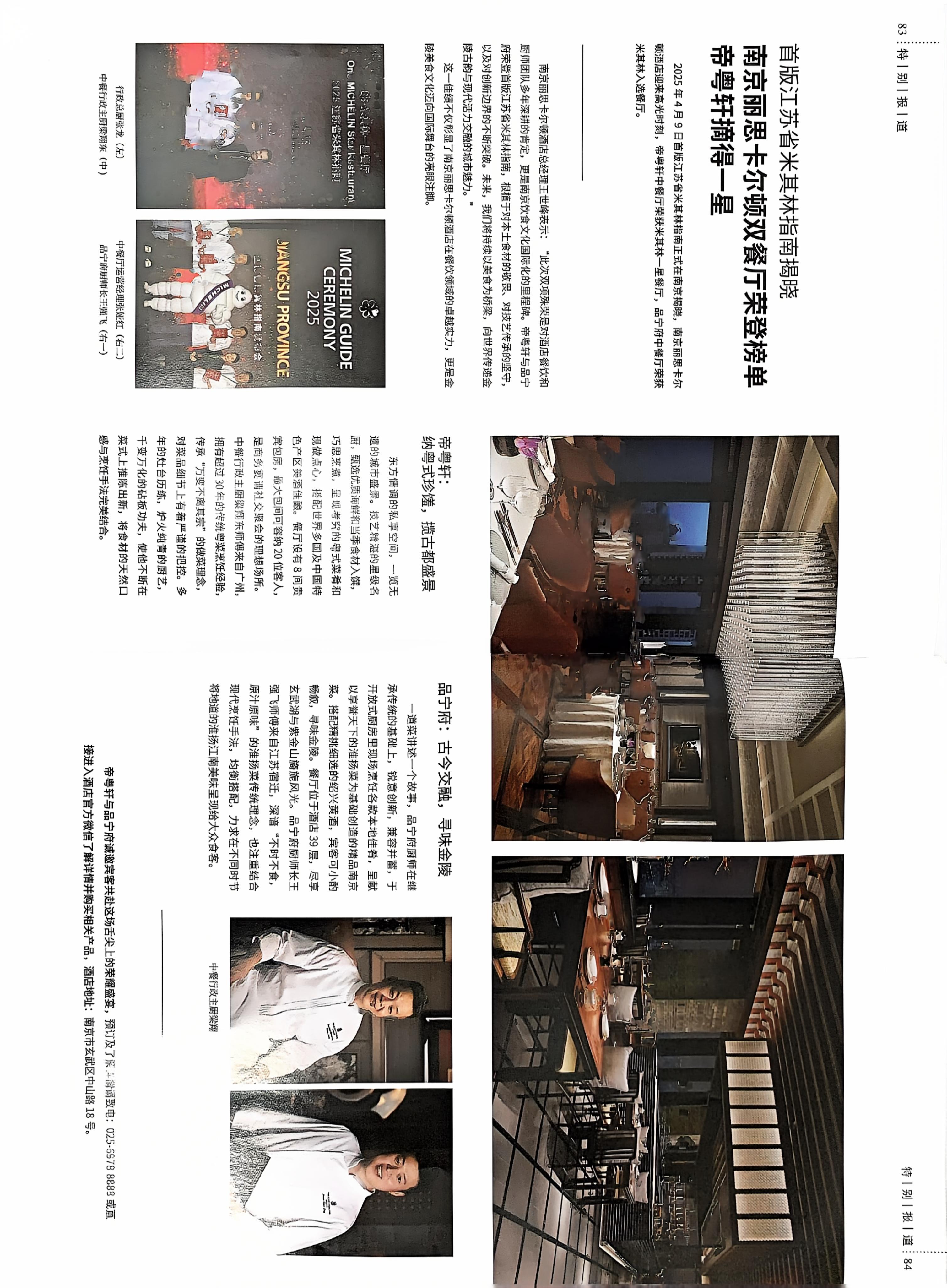 南京丽思卡尔顿双餐厅荣登榜单帝粤轩摘得一星
